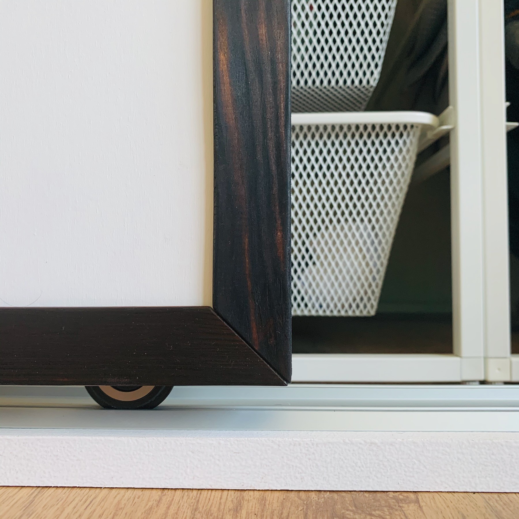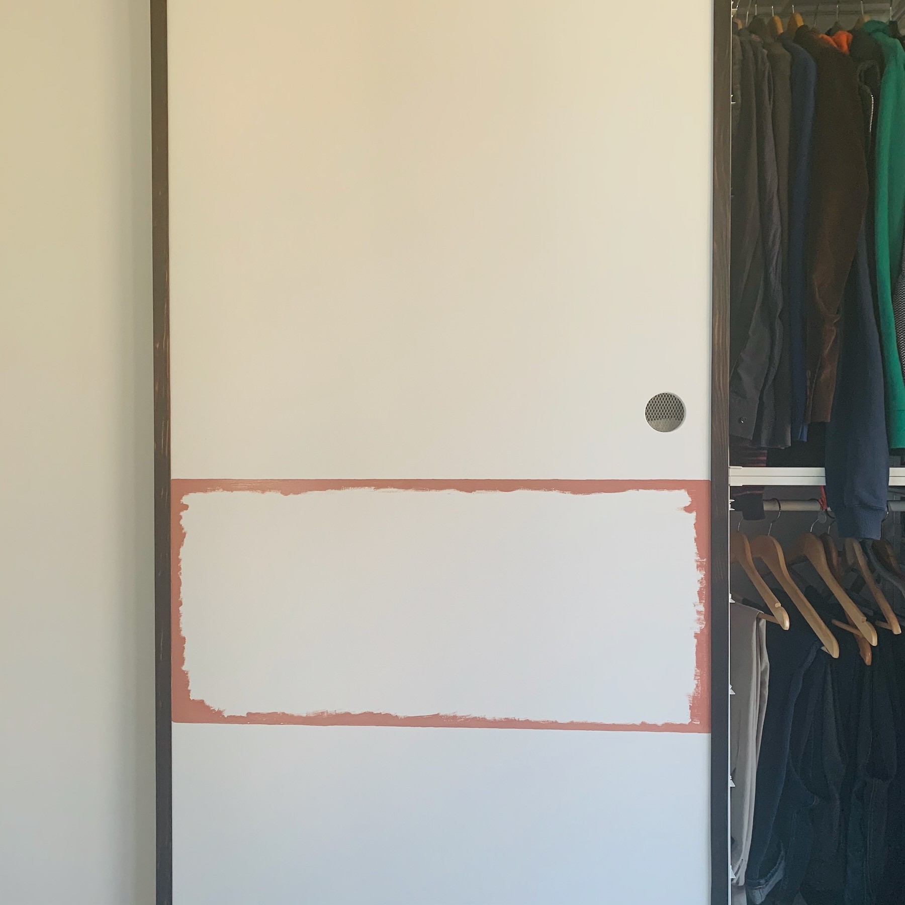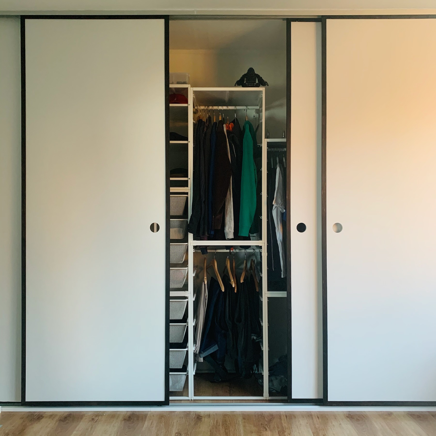 Ik was eigenlijk al bezig met het maken van schuifdeuren voor onze kledingkast, toen ik de deuren zag in de geweldige Ghibli film "My Neighbor Totoro". Veel was er niet nodig om in de buurt van het ontwerp te komen: ronde gaten als handgrepen, een subtiele houten omlijsting (uiteraard zwart gebrand en geölied) en een zachte rood/roze baan die doorloopt over alle vier schuifdeuren.