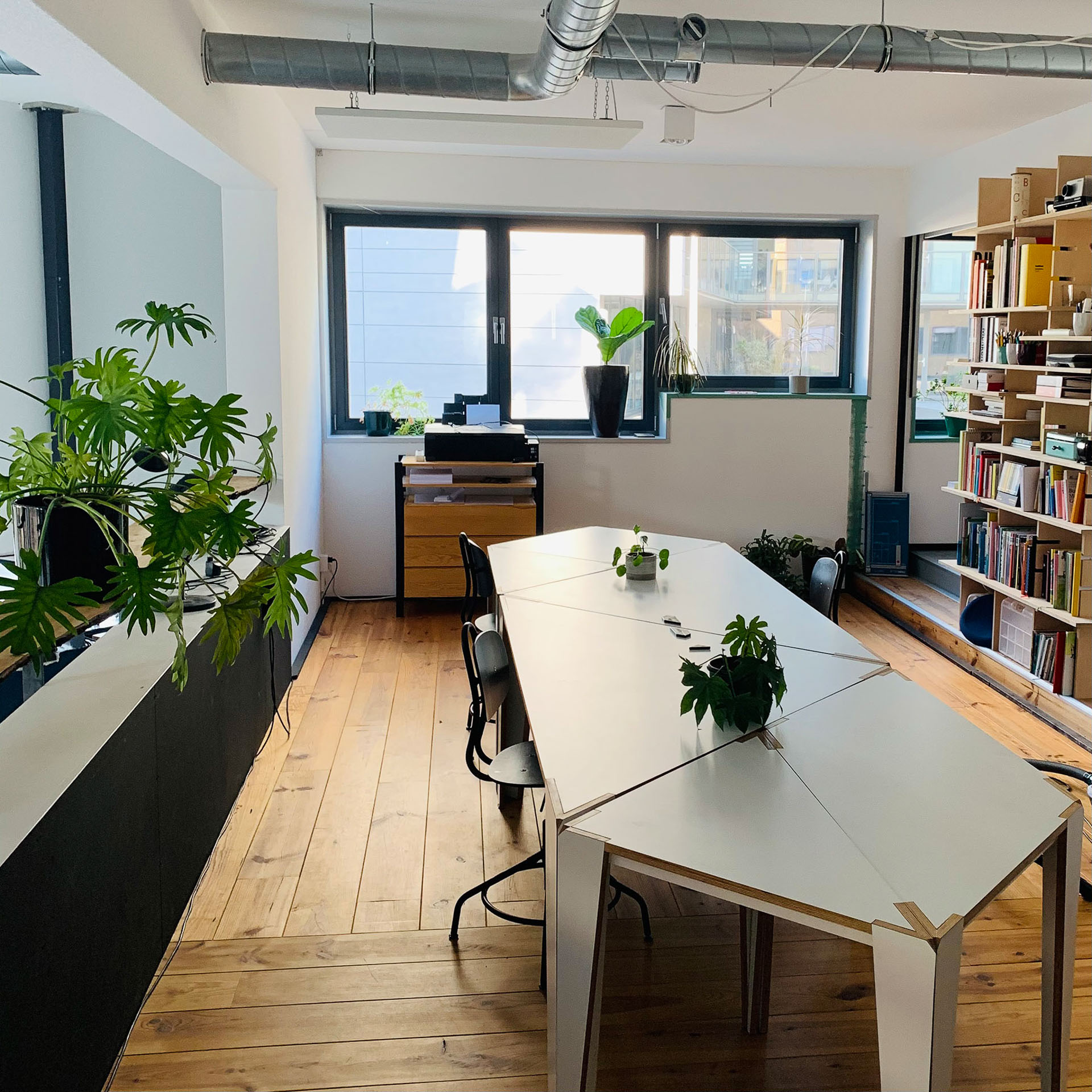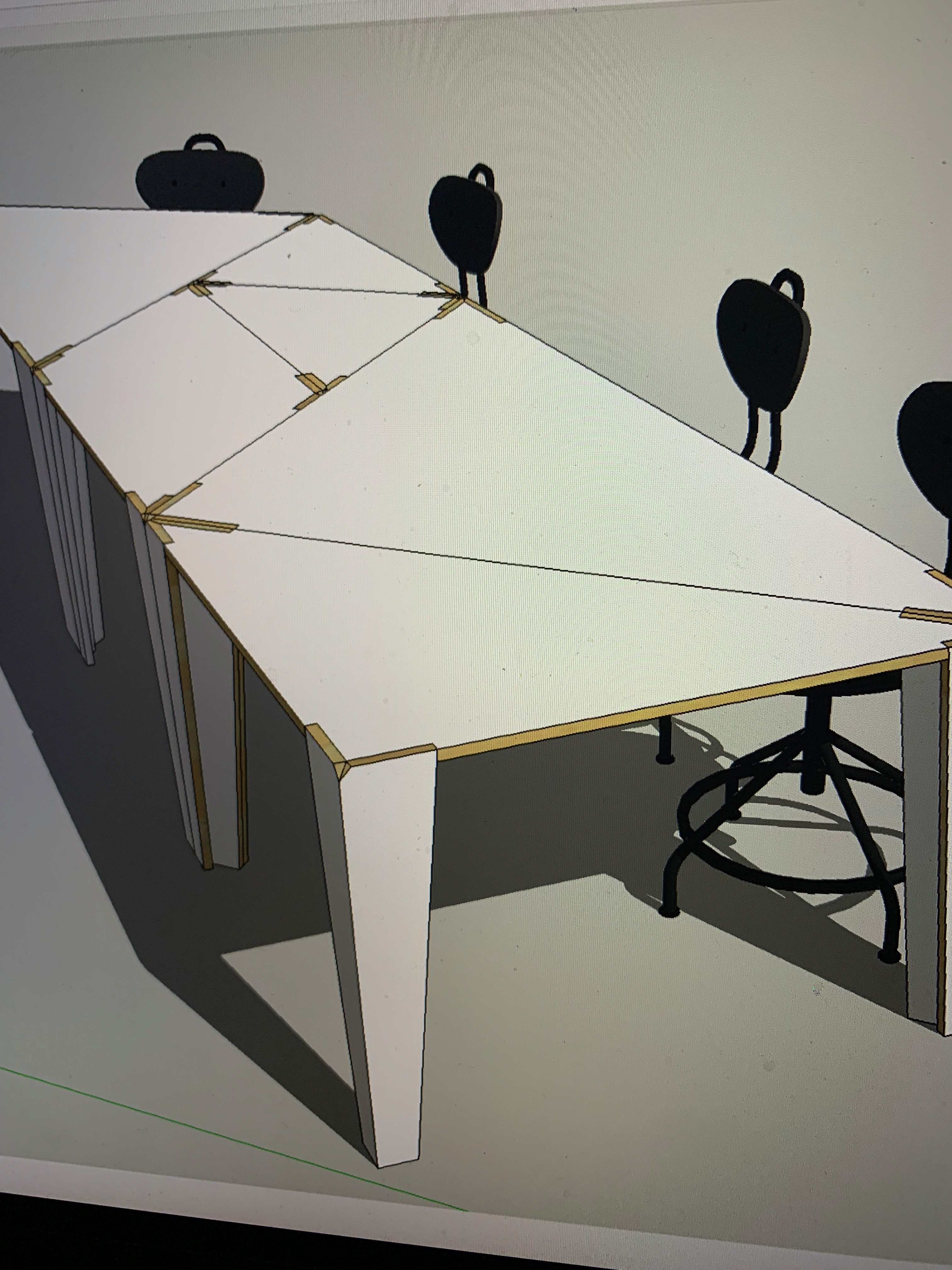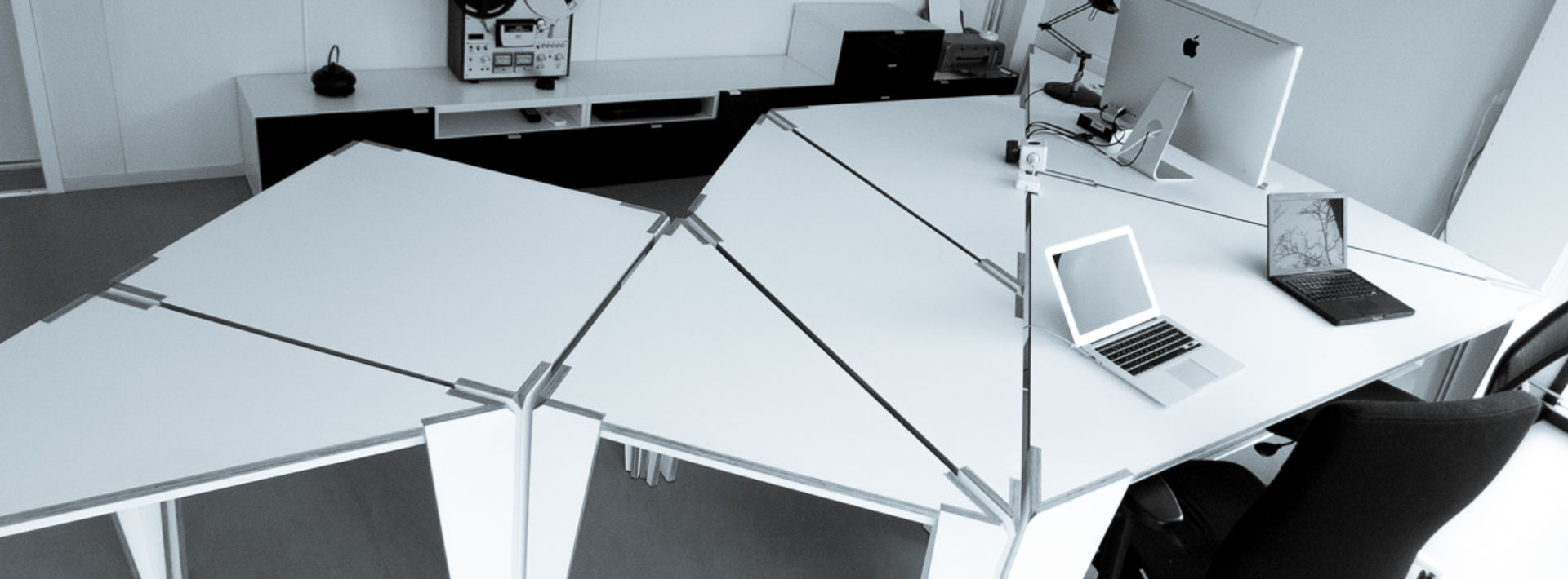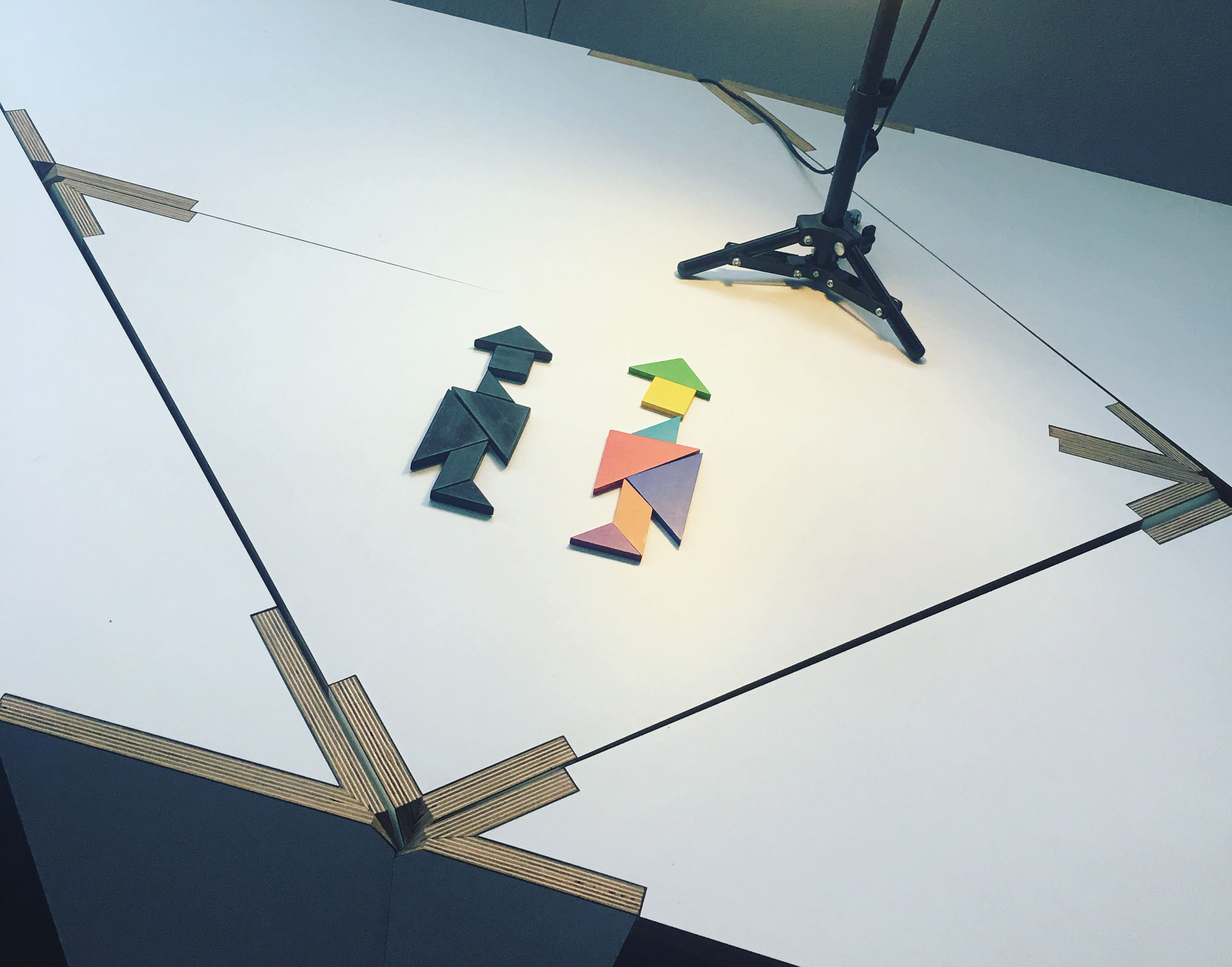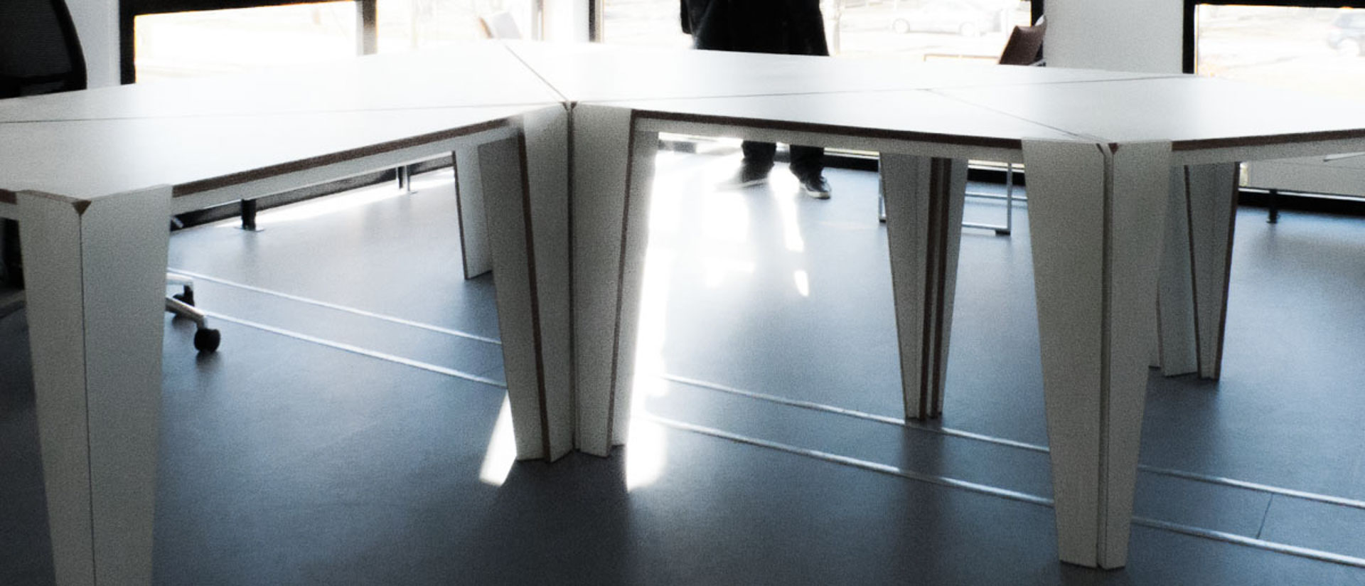 Voor mijn kantoor op Rotsoord heb ik in 2012 deze set van 7 tafels ontworpen gebaseerd op de 4000 jaar oude Chinese Tangram puzzel: 2 grote driehoeken met lange zijdes van ruim 2 meter, 1 middelgrote driehoek, 2 kleine driehoeken, een vierkant en een parallellogram. Door ze te verplaatsen zijn er ontzettend veel configuraties mogelijk.