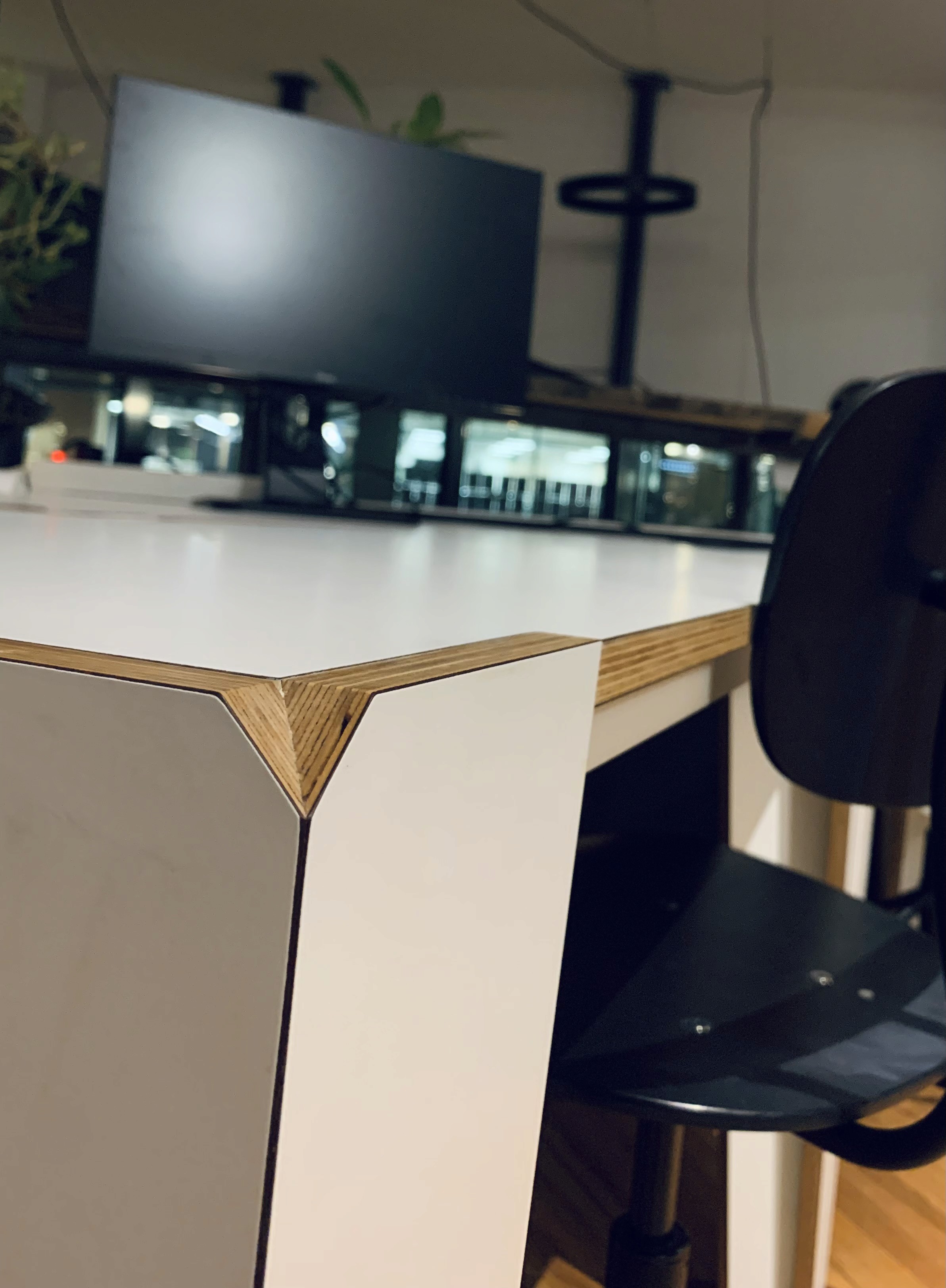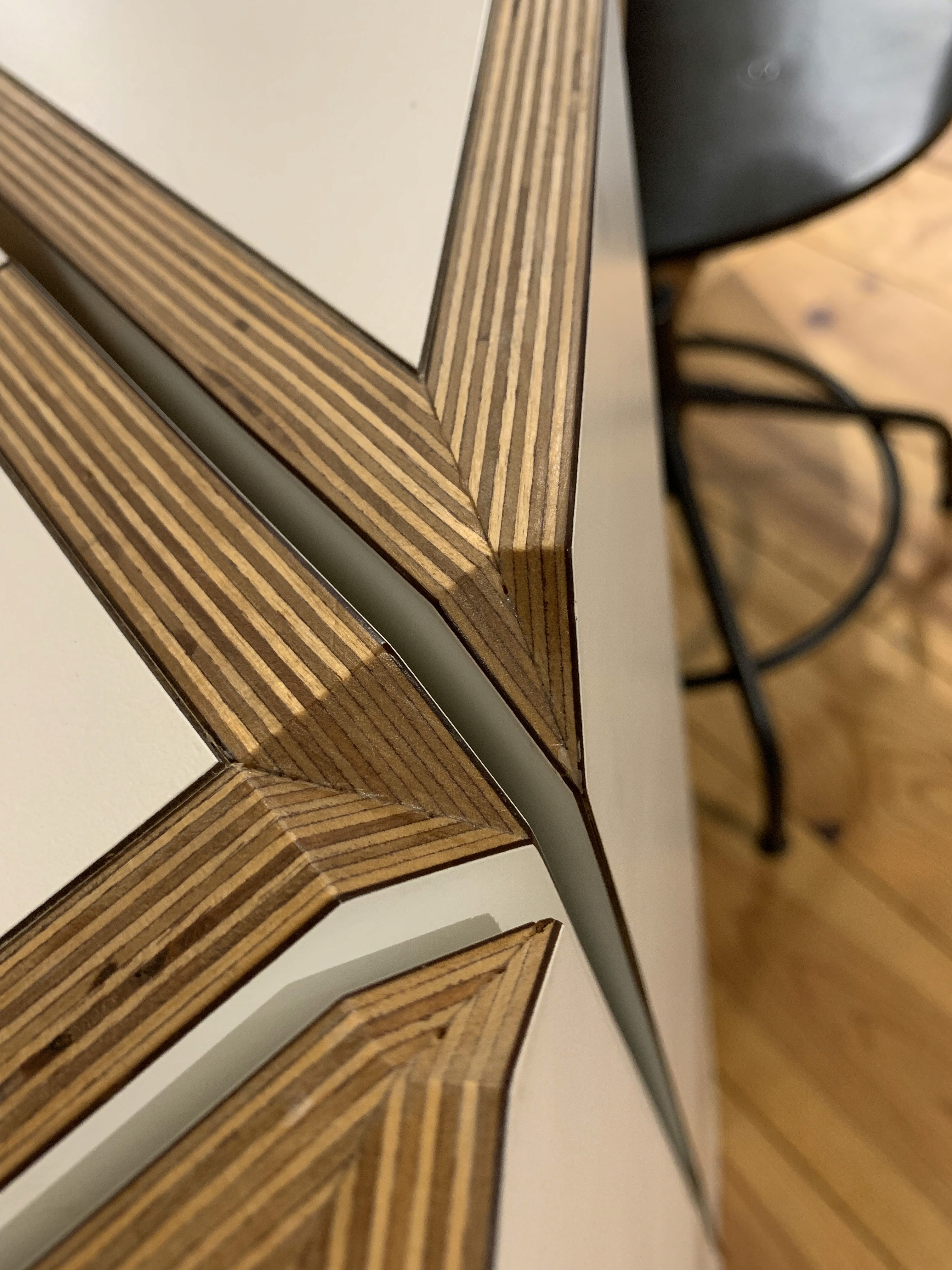 Luc Schoenmakers heeft ze gebouwd. Gezaagd uit berken multiplex met een witte HPL toplaag. Deels met CNC, alle details met de hand.
