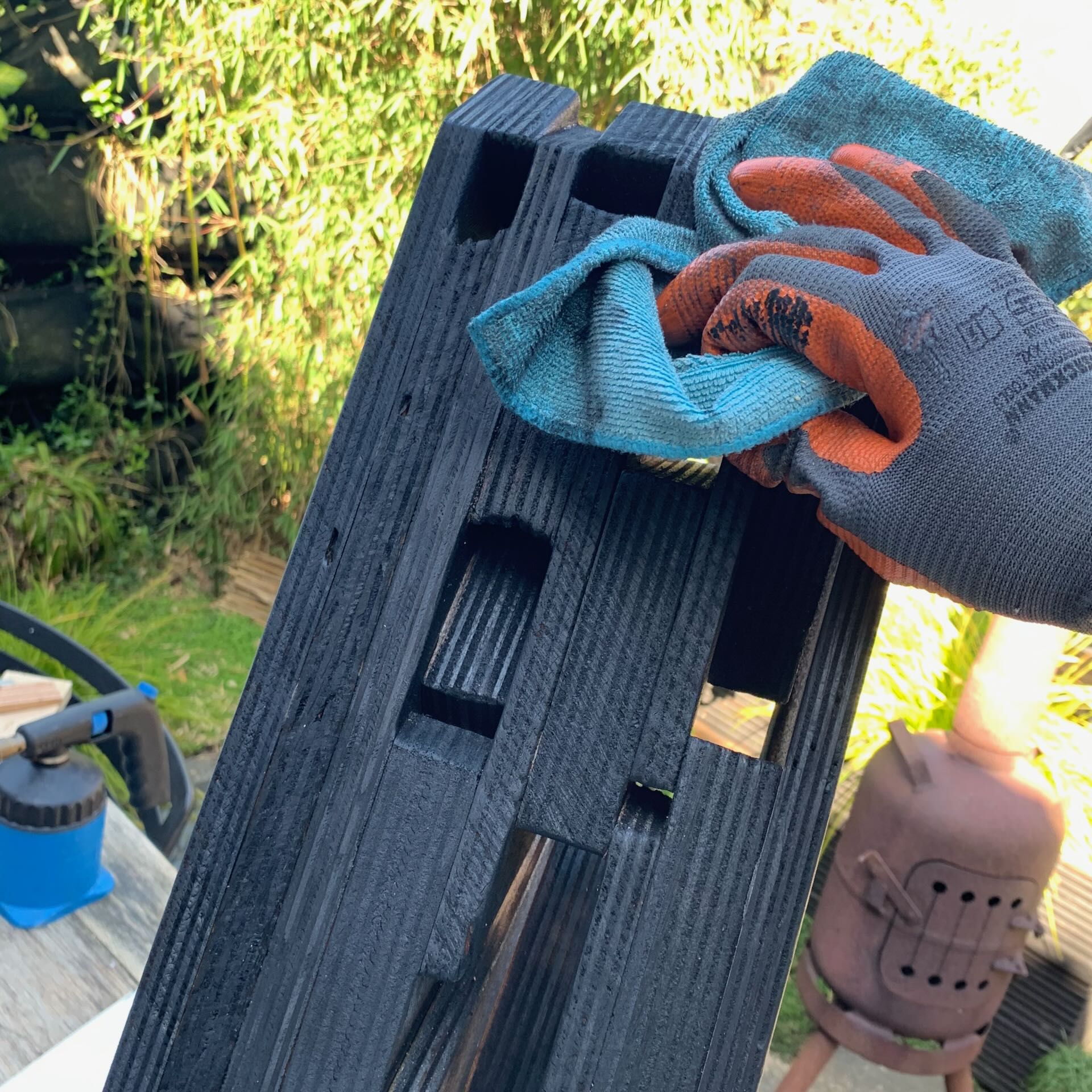 Als ik de kans krijg, probeer ik mijn projecten van massief hout zwart af te werken. Niet door ze eerst te schuren, voor te behandelen en te verven – maar door er met een gasbrander overheen te gaan.
