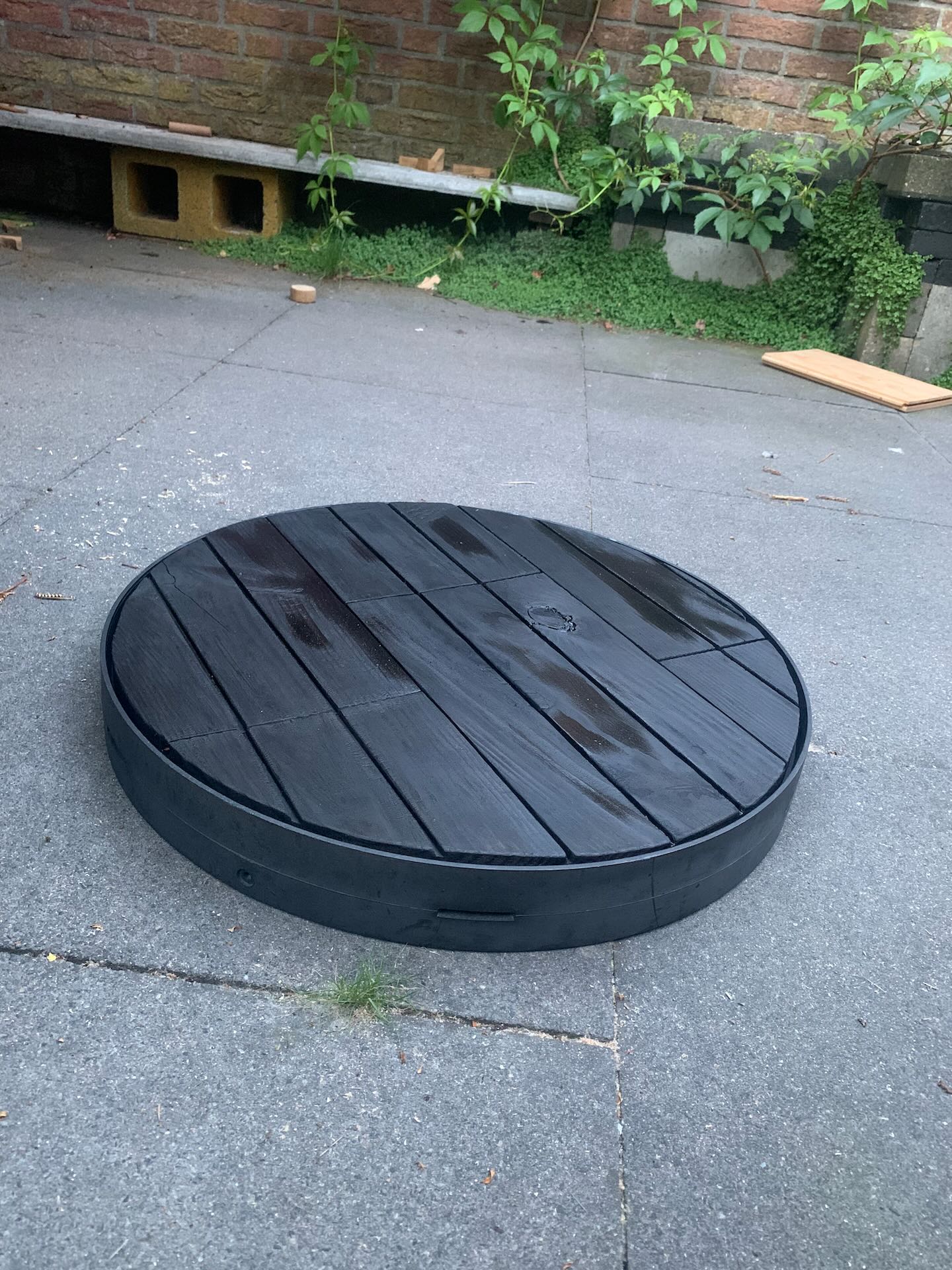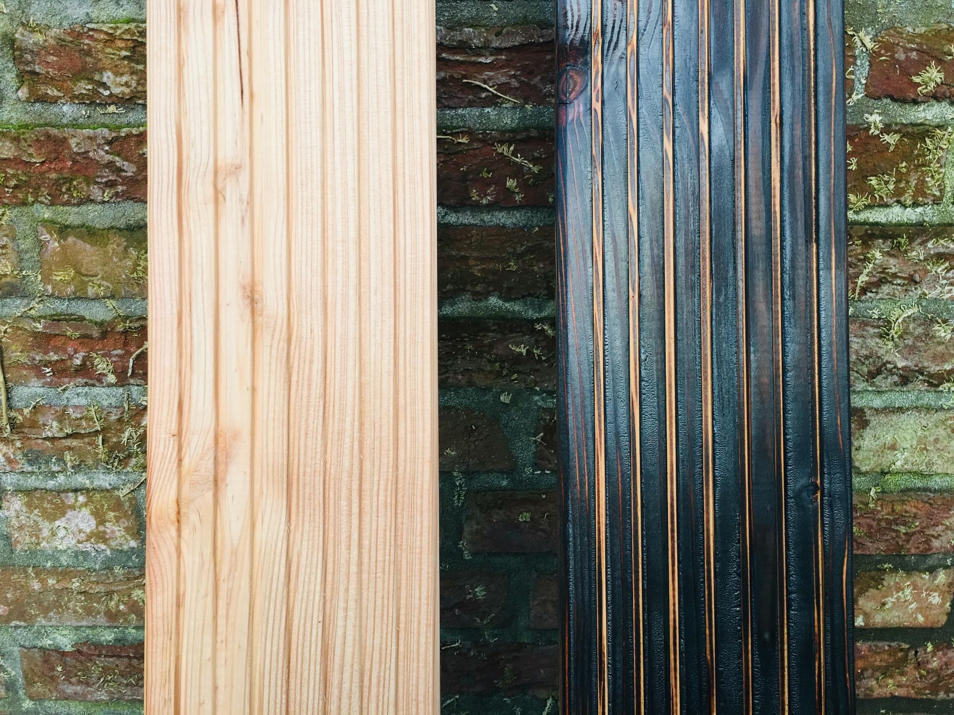 In Japan noemen ze deze techniek Shō Sugi Ban of Yakisugi en gebruiken ze uiteraard traditionele methoden in plaats van met een gasbrander (laat ze 't niet horen). Daar wordt het veelal buiten toegepast en echt diep verkoold, zonder het vervolgens te behandelen met olie – want dit heeft een averechts effect. Zonder olie wordt het water goed afgevoerd, beschermt het goed tegen schimmels en blijft het ademen. In een interieur werkt dat natuurlijk niet – je hebt dan constant zwarte vingers; na het branden spoel ik het hout af en behandel het met wat lijnzaadolie. Na een dag of twee is het goed uitgehard en geeft het niet (of nauwelijks) af.